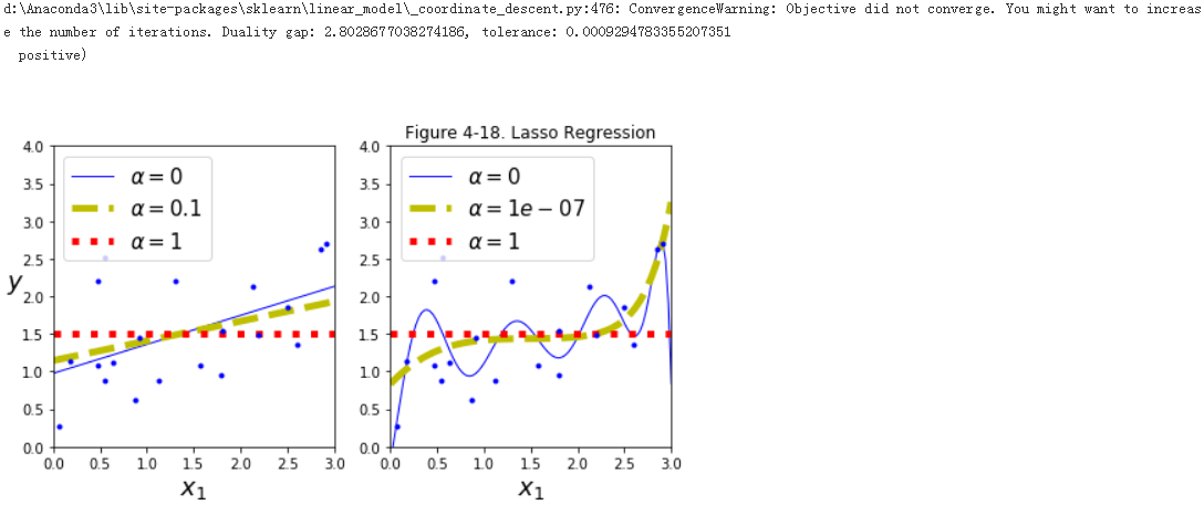 It is important to scale the data (e.g., using a StandardScaler) before performing Ridge Regression, as it is sensitive to the scale of the input features. This is true of most regularized models.from sklearn.linear_model import Lassoplt.figure(figsize=(8,4)) plt.subplot(121) plot_model(Lasso, polynomial=False, alphas=(0, 0.1, 1), random_state=42) plt.ylabel("$y$", rotation=0, fontsize=18)plt.subplot(122) plot_model(Lasso, polynomial=True, alphas=(0, 10**-7, 1), random_state=42) plt.title("Figure 4-18. Lasso Regression") plt.show()
