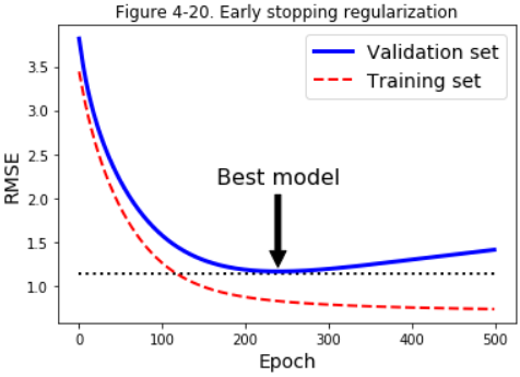 With Stochastic and Mini-batch Gradient Descent, the curves are not so smooth, and it may be hard to know whether you have reached the minimum or not. One solution is to stop only after the validation error has been above the minimum for some time (when you are confident that the model will not do any better), then roll back the model parameters to the point where the validation error was at a minimum.