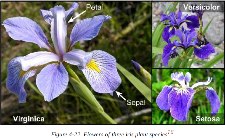 Let’s use the iris dataset to illustrate Logistic Regression. This is a famous dataset that contains the sepal萼片 and petal 花瓣 length and width of 150 iris flowers of three different species: Iris-Setosa, Iris-Versicolor, and Iris-Virginica (see Figure 4-22).