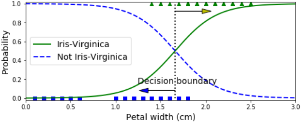 Above about 2 cm the classifier is highly confident that the flower is an Iris-Virginica (it outputs a high probability to that class), while below 1 cm it is highly confident that it is not an Iris-Virginica (high probability for the “Not Iris-Virginica” class). In between these extremes, the classifier is unsure. However, if you ask it to predict the class (using the predict() method rather than the predict_proba() method), it will return whichever class is the most likely. Therefore, there is a decision boundary at around 1.6 cm where both probabilities are equal to 50%: if the petal width is higher than 1.6 cm, the classifier will predict that the flower is an Iris-Virginica, or else it will predict that it is not (even if it is not very confident):
