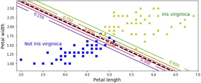 Figure 4-24 shows the same dataset but this time displaying two features: petal width and length. Once trained, the Logistic Regression classifier can estimate the probability that a new flower is an Iris-Virginica based on these two features. The dashed line represents the points where the model estimates a 50% probability: this is the model’s decision boundary. Note that it is a linear boundary. Each parallel line represents the points where the model outputs a specific probability, from 15% (bottom left) to 90% (top right). All the flowers beyond the top-right line have an over 90% chance of being Iris-Virginica according to the model.