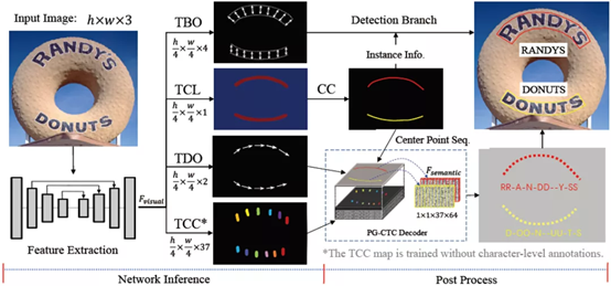 PGNet提出的方法框架如下图所示,输入的图象经过Backbone网络得到1/4下采样特征图,通过多任务学习,同时回归四个任务的内容,包括文本边缘偏移量预测(TBO),文本中心线预测(TCL),文本方向偏移量预测(TDO)以及文本字符分类图预测(TCC)。其中文本行的检测结果由TBO以及TCL经过后处理得到,文本行的识别结果由TCL,TDO以及TCC的输出得到。