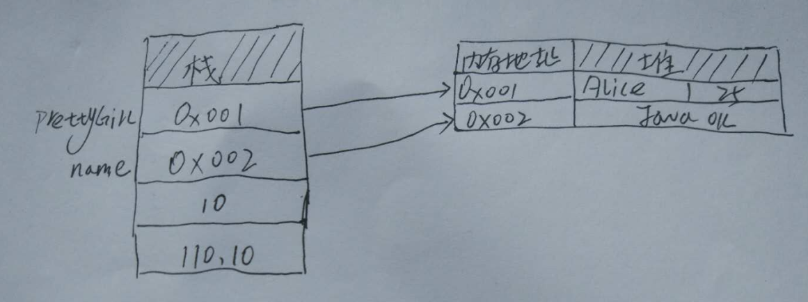通过类名 对象名 = new 类名()创建对象, 在 PrettyGirl prettyGirl = new PrettyGirl();这行代码在内存中就创建了两块内存空间,第一块在栈中,名字叫 prettyGirl,它是一个引用地址,并不放具体的数值,第二块堆中的内存才存放具体的数值,如name,age等信息。