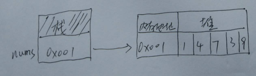 上面这一行代码做了两件事情,首先在堆中分配一块存放具体数值的内存,然后将这个内存的首地址赋给上面声明的引用变量!