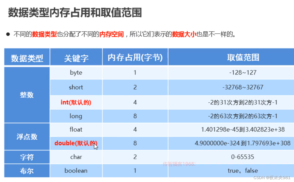如果要定义 一个整数类型的变量,不知道选择哪种数据类型了,默认使用int。