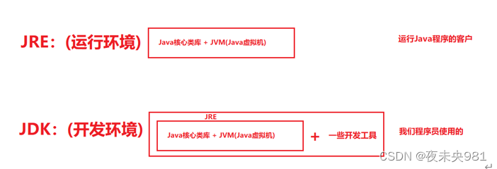 1).JRE:全称:Java运行时环境。指“运行Java程序”所需要的“软件环境”。JRE中包含:Java核心类库 + JVM(Java虚拟机)