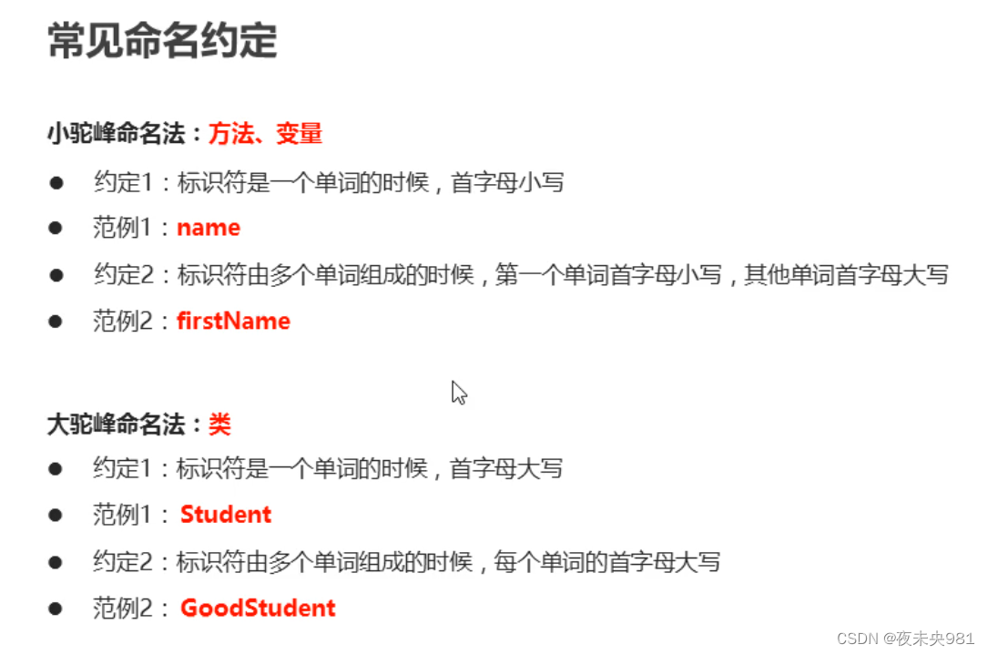 标识符:给类,方法,变量起名字的。(大小驼峰命名法)