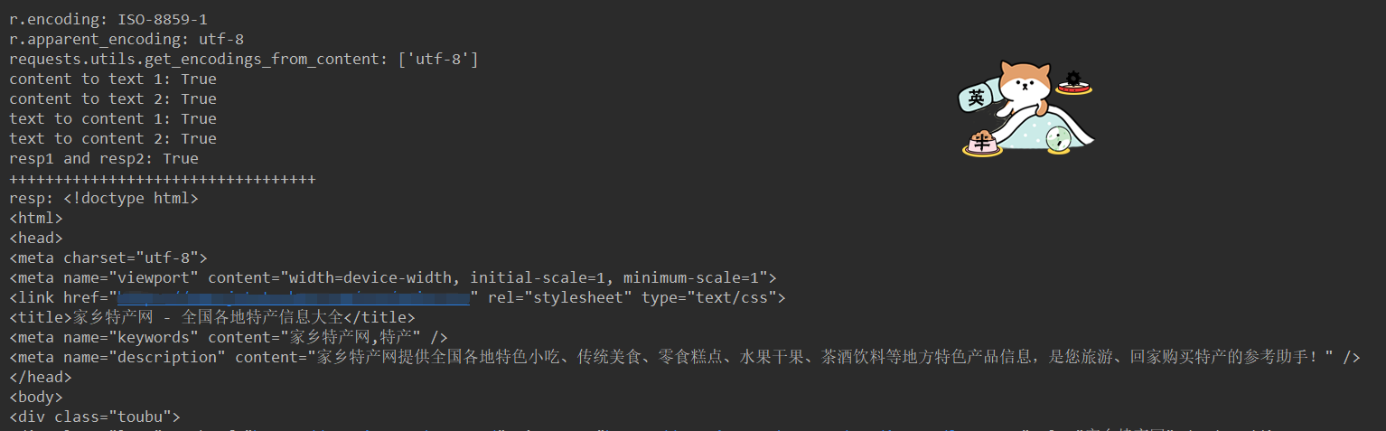 import requestsdef do_post():r =requests.get("xxxxx")if r.status_code != requests.codes.ok:return Noneprint("r.encoding:", r.encoding)print("r.apparent_encoding:", r.apparent_encoding)print("requests.utils.get_encodings_from_content:", requests.utils.get_encodings_from_content(r.text))print("content to text 1:", r.content.decode(r.encoding) == r.text)print("content to text 2:", str(r.content, encoding=r.encoding) == r.text)print("text to content 1:", r.text.encode(r.encoding) == r.content)print("text to content 2:", bytes(r.text, encoding=r.encoding) == r.content)# 方法1,根据编码进行转换resp1 = r.content.decode(r.apparent_encoding)# print(r.text)# 方法2,设置页面的编码r.encoding = r.apparent_encodingresp2 = r.textprint("resp1 and resp2:", resp1 == resp2)print("++++++++++++++++++++++++++++++++++")print("resp:", resp1)