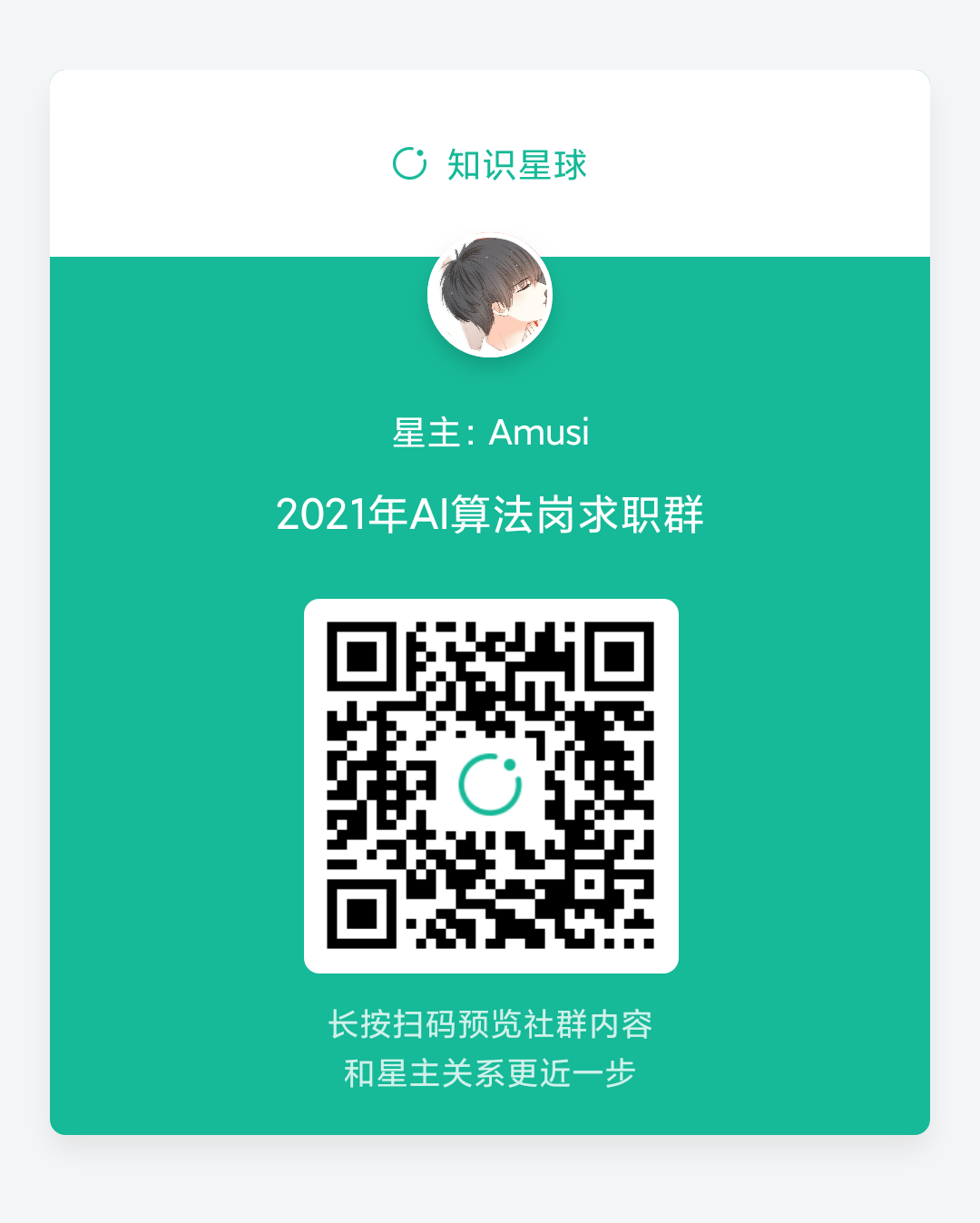 本星球不仅面向2021届、2022届找工作和找实习的学生(研一/研二/大三/大四等),还面向刚入学或已工作的人群。目前已有超过2890+位同学加入。星球旨在分享AI算法岗的秋招准备攻略(含刷题)、面试经验和校招/社招/实习的内推机会(含提前批)、学习路线、知识题库和Offer如何选择等。