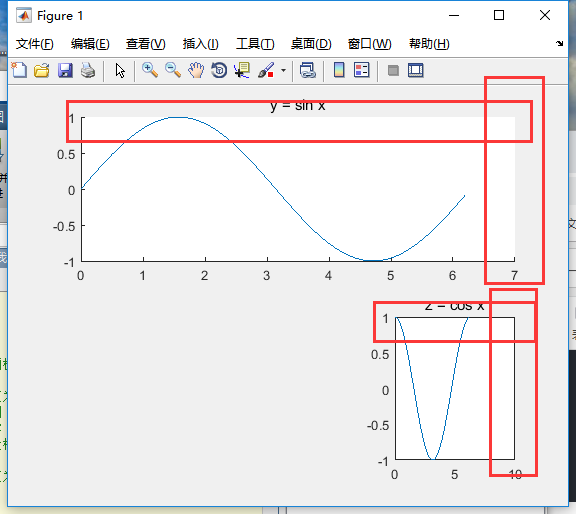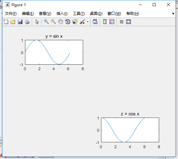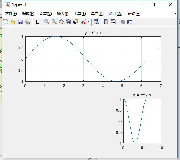 title('y = sin x'); % 这个区域的名字subplot(2, 3, 6); % 给绘图花瓣分区为2行3列,选中第六个区域