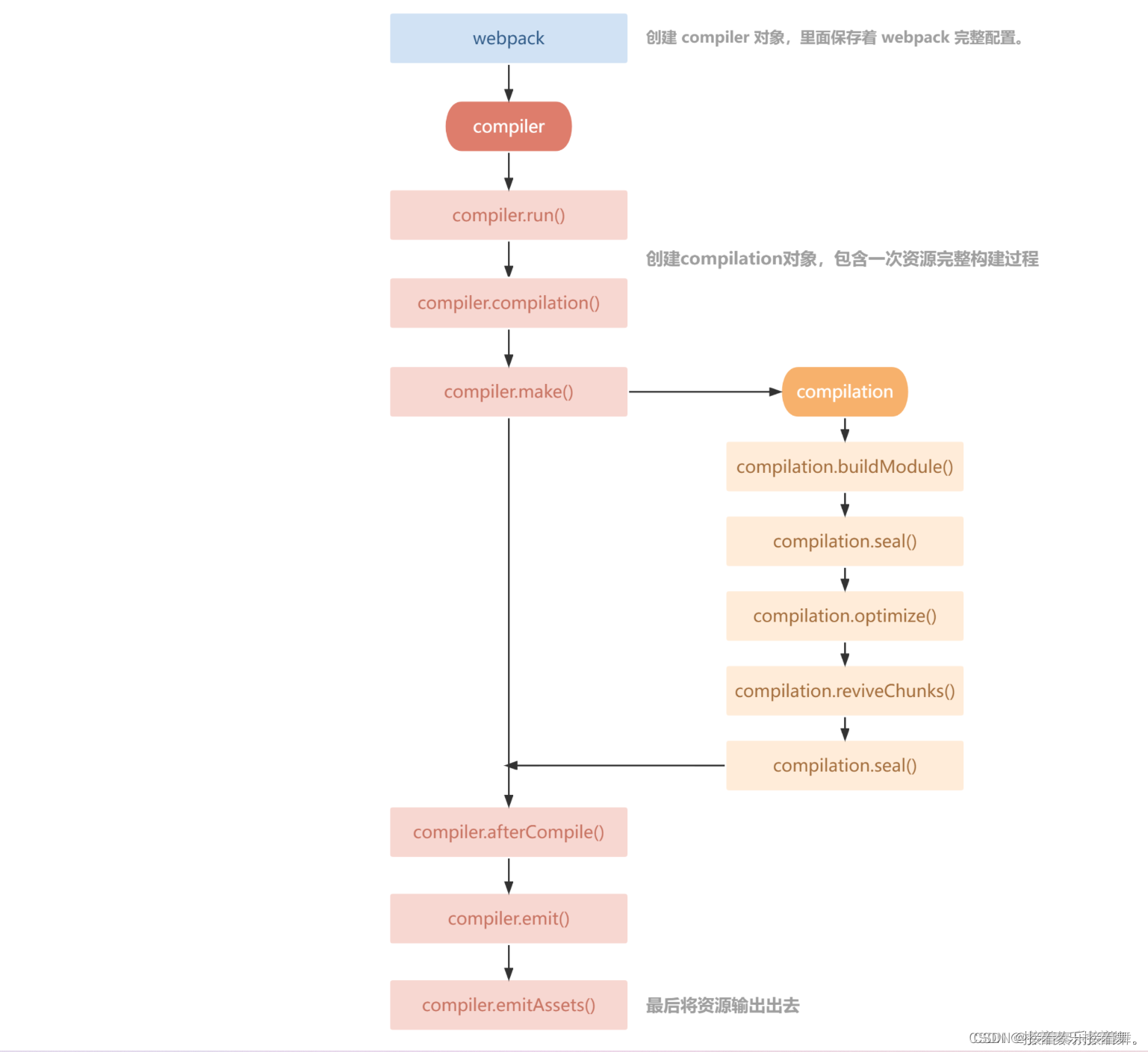 一个 compilation 对象会对构建依赖图中所有模块,进行编译。 在编译阶段,模块会被加载(load)、封存(seal)、优化(optimize)、 分块(chunk)、哈希(hash)和重新创建(restore)。