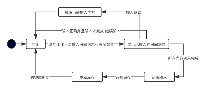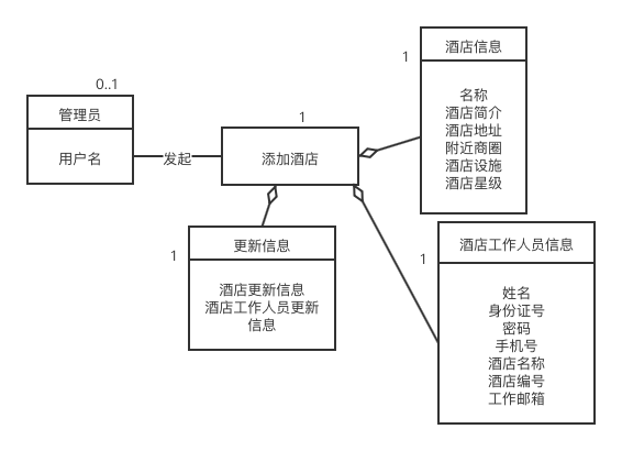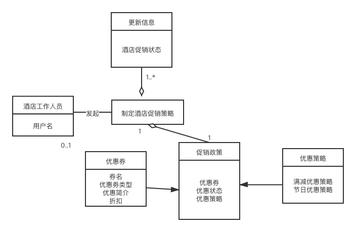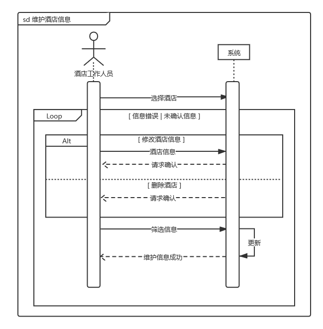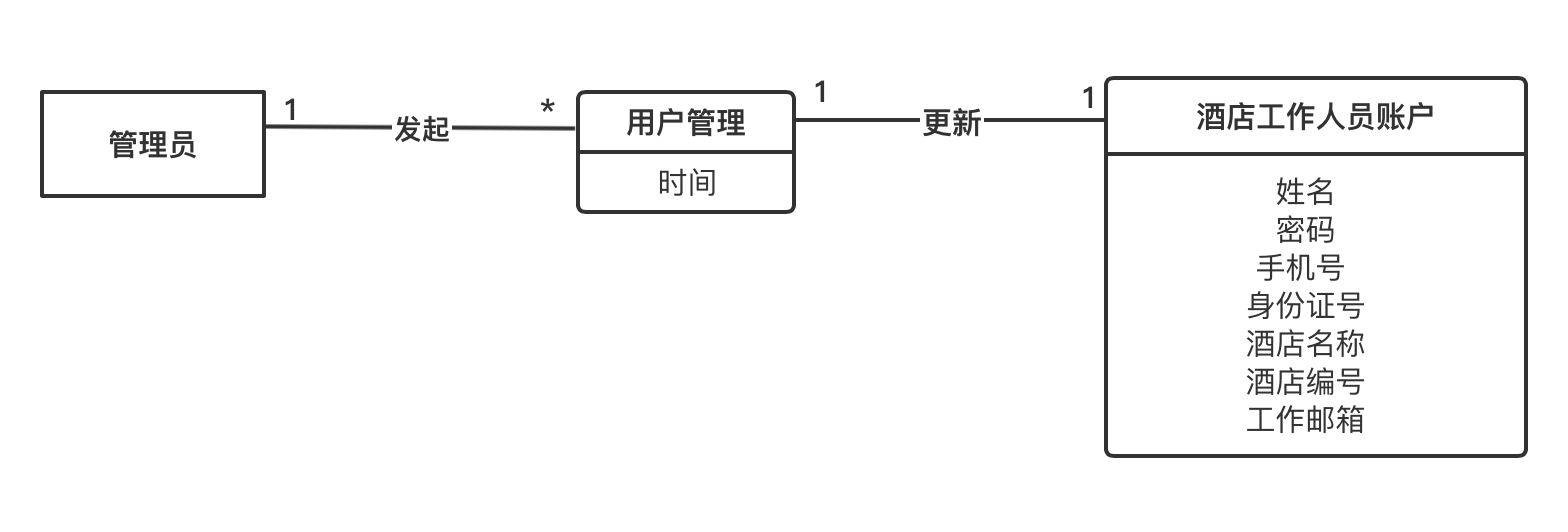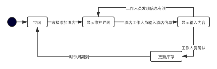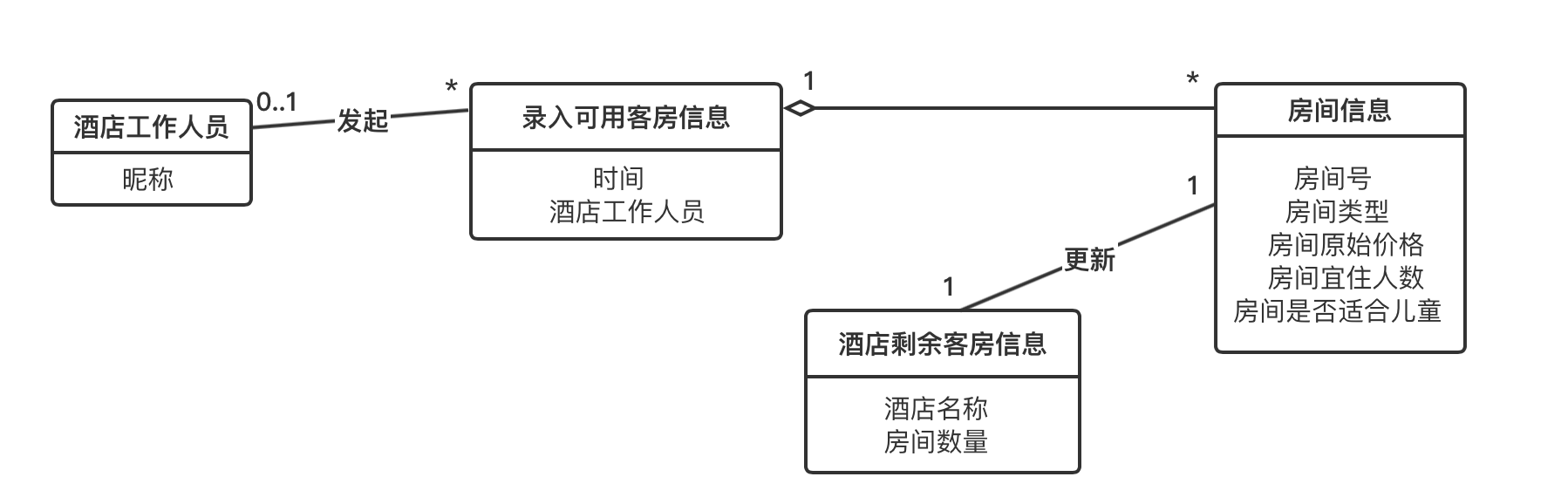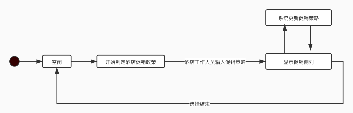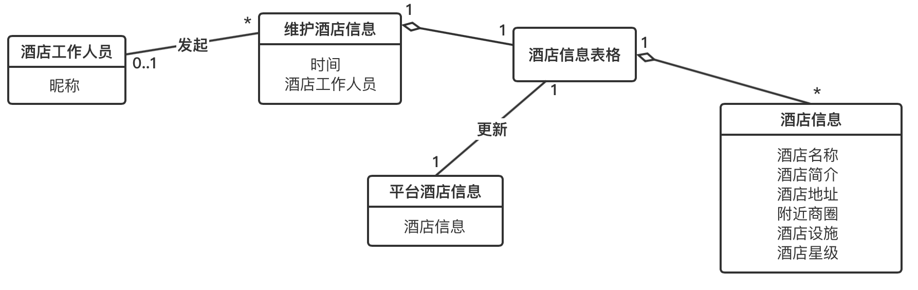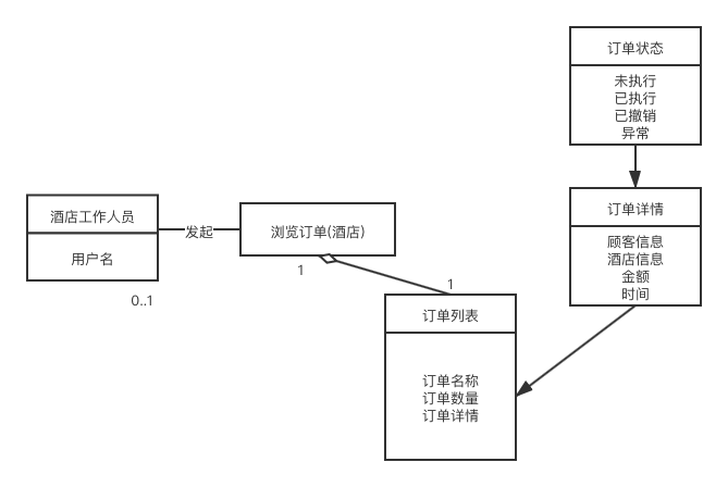 | 酒店工作人员 | 1. 个人基本信息管理 7. 维护酒店信息 8. 录入可用客房 9. 制定酒店促销策略 10. 浏览订单(酒店) 5. 撤销订单 11. 订单执行 12. 更新入住和退房信息 |