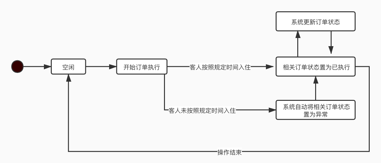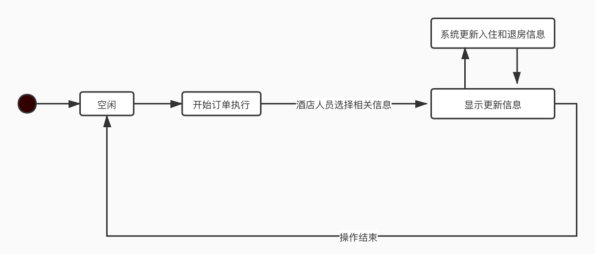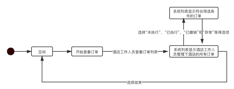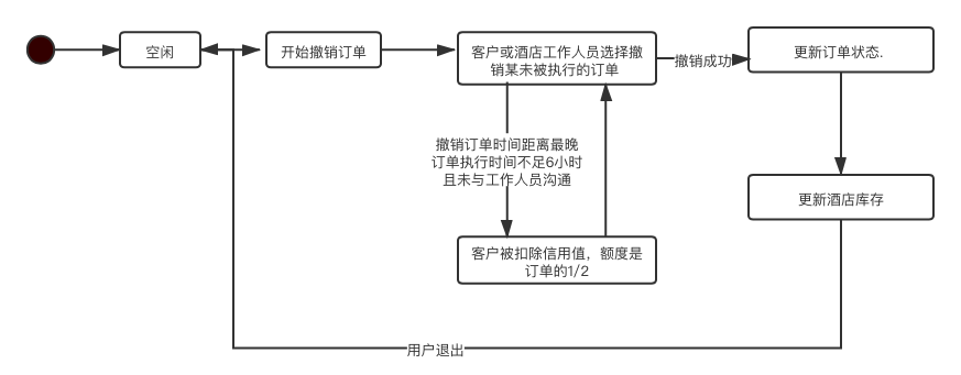 | 正常流程 | 1. 客户或酒店工作人员选择撤销某未被执行的订单 2. 系统将相关订单状态置为已撤销状态,记录撤销状态 3. 系统更新客户信息和酒店房间信息 |