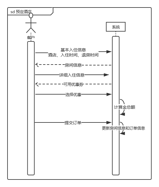 | 扩展流程 | 1a. 客户填写的入住时间和订单时间间隔超过一个月 1. 系统提示无法进行该预定 3a. 儿童人数占总人数 90% 以上 1. 系统提示无法进行该预定,并提供相关酒店工作人员电话,建议客户通过电话预定 3b. 入住人信息少于预定房间数量 2. 系统提示无法进行该预定,要求客户完善具体入组信息 3c. 客户使用优惠券 4. 系统计算订单价格时使用优惠策略 4a. 客户申请修改预定信息 1. 系统更新房间信息,回到步骤 2,再次请求入住信息填写 4b. 客户取消预订酒店 2. 系统更新房间信息,取消该预定,生成无效订单信息 6a. 历史记录 1. 系统将订单信息更新至客户的历史记录 2. 系统将订单信息发送给相关酒店工作人员,并根据补贴额度向相关酒店支付补贴金 |