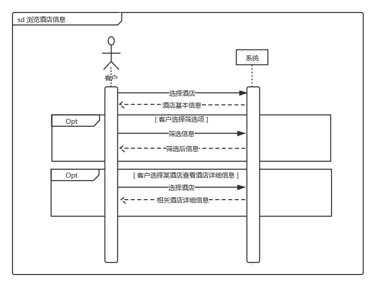 | 正常流程 | 1. 系统列表显示酒店基本信息,酒店基本信息包括酒店名称,酒店地址,酒店评分和预定起价等 2. 客户选择筛选项,筛选项包括地理位置、价格区间和是否曾经预定等 3. 系统列表显示筛选后的酒店基本信息 4. 客户选择某酒店查看酒店详细信息 5. 系统显示相关酒店详细信息,酒店详细信息包括酒店名称,酒店简介,酒店地址,附近商圈,酒店设施,酒店星级,酒店评分,详细价格和过往订单等 |