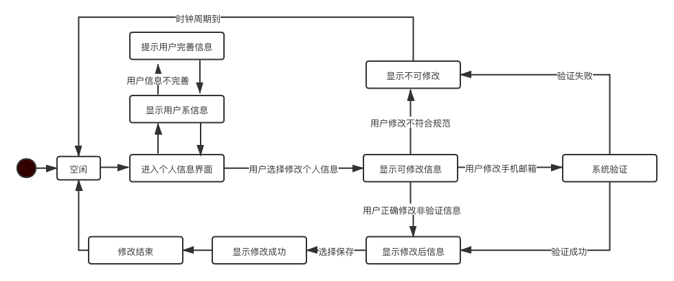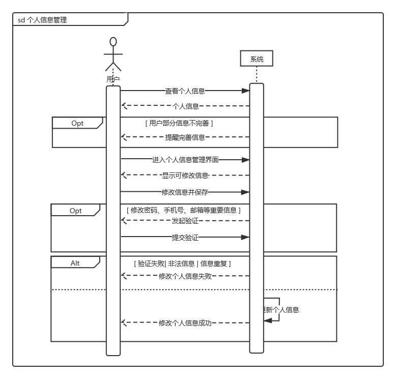 | 正常流程 | 1. 系统显示个人信息和修改功能。客户信息包括昵称,姓名,手机号,个人邮箱,信誉积分等;酒店工作人员信息包括昵称,姓名,密码,手机号,酒店名称,酒店编号,工作邮箱等 2. 用户打开修改个人信息界面 3. 系统显示个人信息修改界面。客户修改内容包括昵称,手机号,个人邮箱,密码,实名认证等;酒店工作人员修改内容包括昵称,手机号,密码等 4. 用户修改个人信息并保存 |
