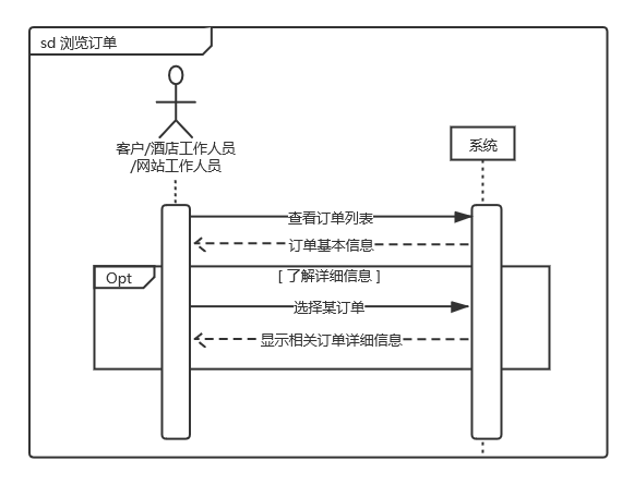 | 正常流程 | 1. 系统按照时间顺序列表显示客户的订单基本信息,基本信息包括酒店名称,入住时间,退房时间,订单价格,是否支付 2. 客户点击某订单了解详细信息 3. 系统显示相关订单详细信息,详细信息包括酒店名称,酒店介绍,预订房间类型,酒店联系方式,入住时间,退房时间,订单价格,是否支付,入住客户个人信息,入住客户联系方式 |