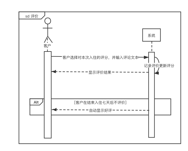 | 正常流程 | 1. 客户选择对本次入住的评分,并输入评论文本 2. 系统记录客户评价并更新酒店评分 |