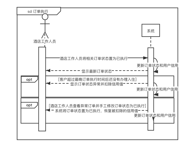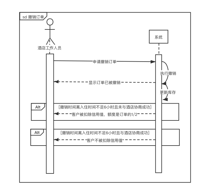 | 扩展流程 | 3a. 撤销订单时间距离最晚订单执行时间不足 6 小时 1. 若客户与酒店工作人员协商撤销订单,客户不会被扣除信用值 2.若客户未与酒店工作人员协商撤销订单,客户被扣除信用值,额度是订单的 1/2 |