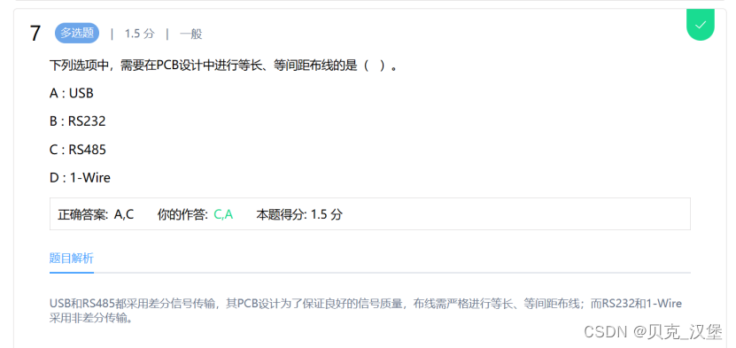 USB和RS485都采用差分信号传输,其PCB设计为了保证良好的信号质量,布线需严格进行等长、等间距布线;而RS232和1-Wire采用非差分传输。