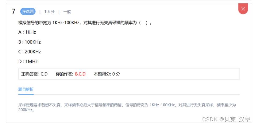 36、采样定理要求若想不失真,采样频率必须大于信号频率的两倍。信号的带宽为 1KHz-100KHz,对其进行无失真采样,频率至少为200KHz。