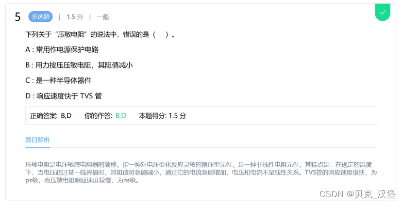 34、压敏电阻是电压敏感电阻器的简称,指一种对电压变化反应灵敏的限压型元件,是一种非线性电阻元件,其特点是:在规定的温度下,当电压超过某一临界值时,其阻值将急剧减小,通过它的电流急剧增加,电压和电流不呈线性关系。TVS管的响应速度很快,为ps级,而压敏电阻响应速度较慢,为ns级。