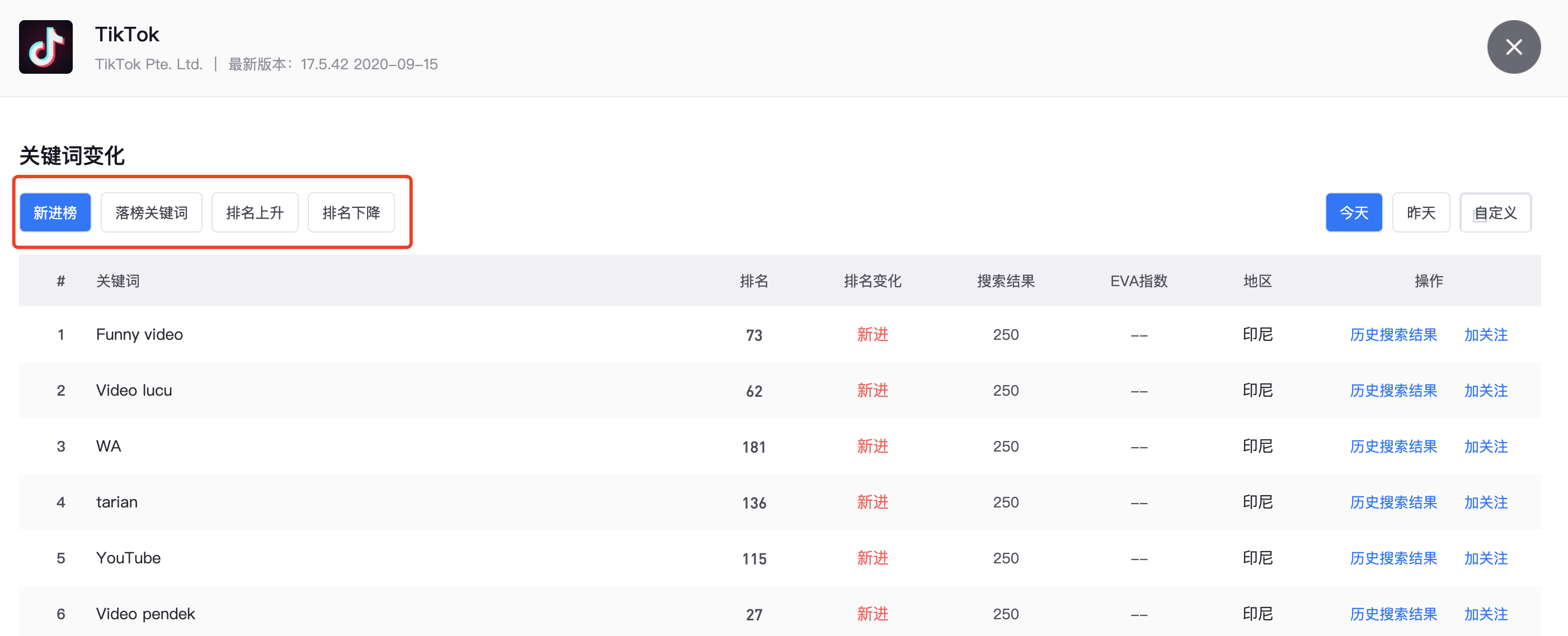 根据 apptweak 的观察是需要6-8周,谷歌可能会通过计算每个关键词的转化率来确定排名。等关键词排名稳定之后,再决定如何更新元数据。我们可以用「EVA数据」监测每日进榜和落榜关键词以及关键词排名变化。