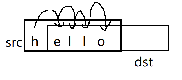 这样拷贝最终的结果是目标串dst中都是h。即发生了内存重叠的问题。