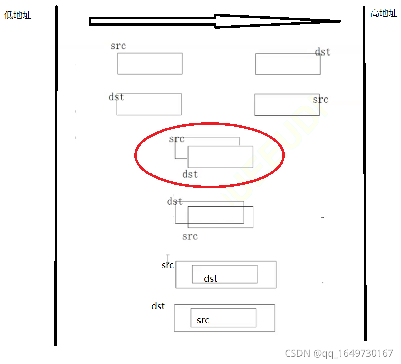 如图,内存重叠发生在这种情况下,即目标串的地址大于源串的地址。
