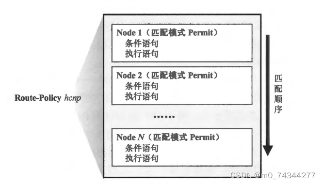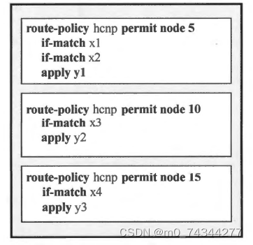 路由策略的匹配规则:自上而下,逐一匹配,一旦匹配上则将按照对应的规则来执行动作,不再向下匹配。末尾隐含拒绝所有的规则。