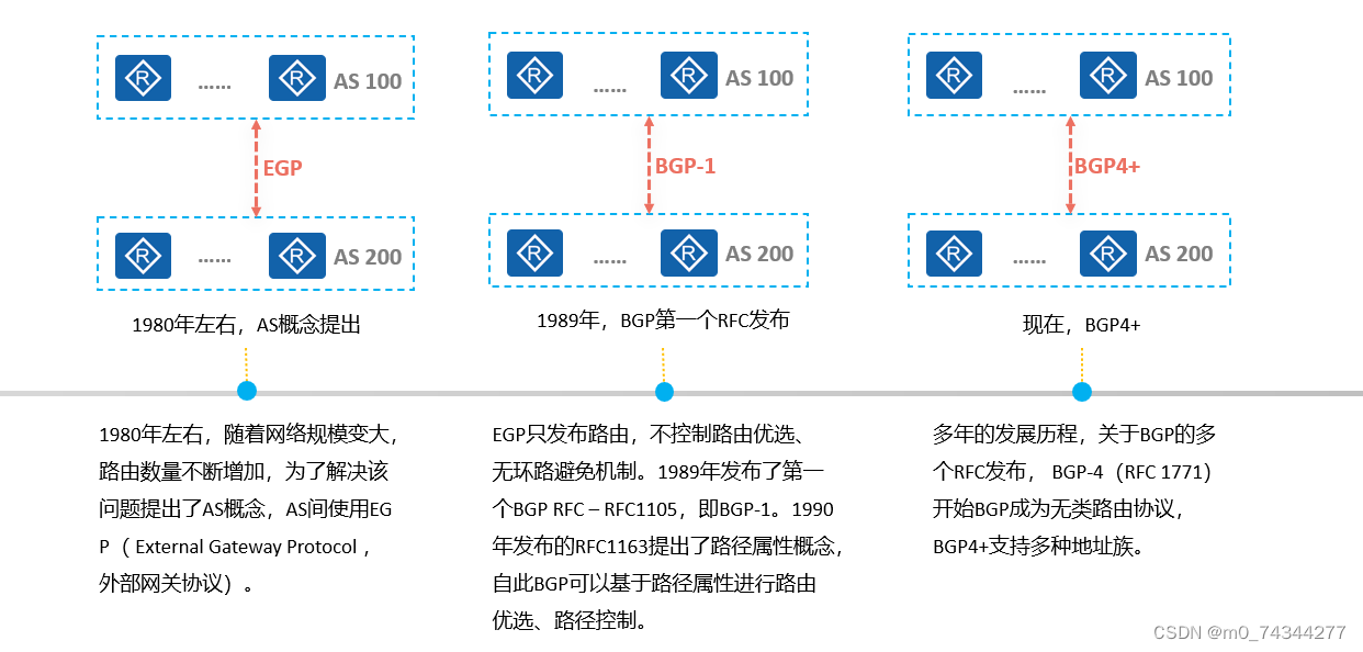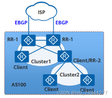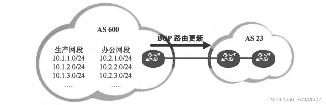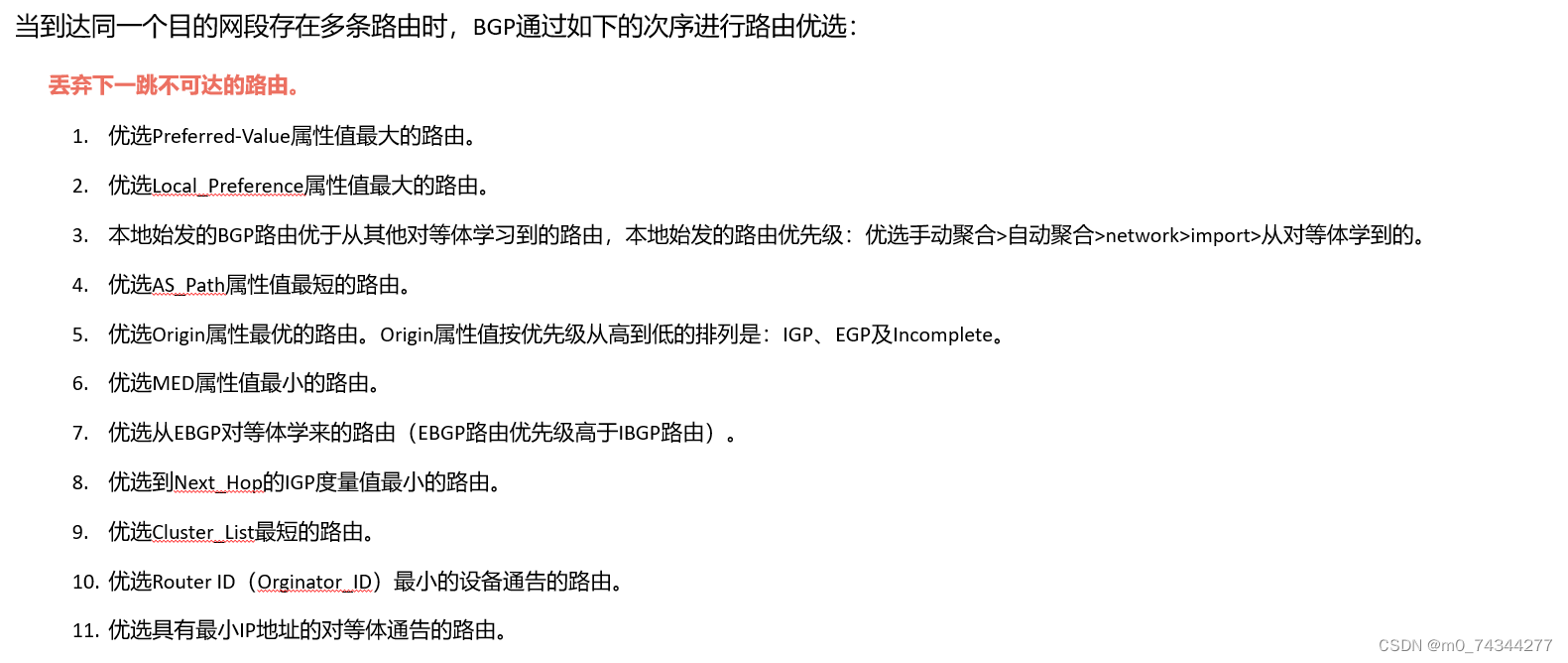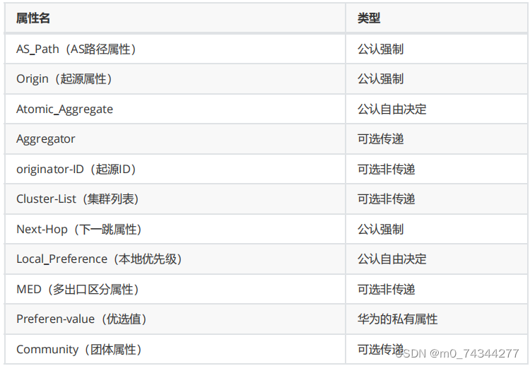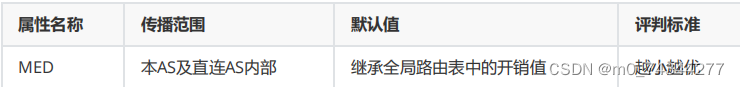 MED----- 多出口鉴别属性 MED 值是继承了 IGP 协议的度量值。 MED 属性值可以传递给自己的 EBGP 对等体,并且该 EBGP 对等体可以将该路由传递给自己的 IBGP 对等 体,并且因为AS-BY-AS 规则,该属性在 IBGP 对等体之间传递时不变。 MED 属性可以干扰访问本地的流量的走向 。也就是说,本 AS 的策略调整可以影响到别的 AS 对路径的 判断, 这是在 BGP 选路中唯一一个可以影响到其他 AS 的属性 。 BGP 规定,非本地始发的 BGP 路由信息,在传递给自己的 EBGP 对等体时,将 MED 值修改为 0 。 边界设备均发布路由信息 。 总结: MED 值默认初始值并不为 0 ,而是继承了路由表中该路由条目的开销值,所以, MED 参数可以反映到 达目的网段在本AS 内部的开销大小,通过这个参数,别的 AS 的流量在进入本 AS 时可以选择开销较小的入 口进入。通过修改该属性,可以影响其他AS 的流量流入本 AS 路径。 若本地通过 IBGP 对等体学习到一条 BGP 路由,其中存在 MED 值,之后需要将这条路由在传递给本地的 EBGP对等体时,则不再携带该属性。这种设置将有可能造成选路不佳的情况,所以,建议,如果存在多 组边界设备需要将路由发送给EBGP 对等体关系时,需要将所有的路由信息均发布。 MED 的传播范围只能是在发布该路由的 AS 以及他直连的 AS 内部。 注意: MED 值影响的是别的 AS 的流量通过多个出口进入到本 AS 内部,如果流入的不是同一个 AS ,也就是说收到的路由条目中的AS_Path 属性最左边的 AS 号不同,则将不比较第六条,直接比较第七条。