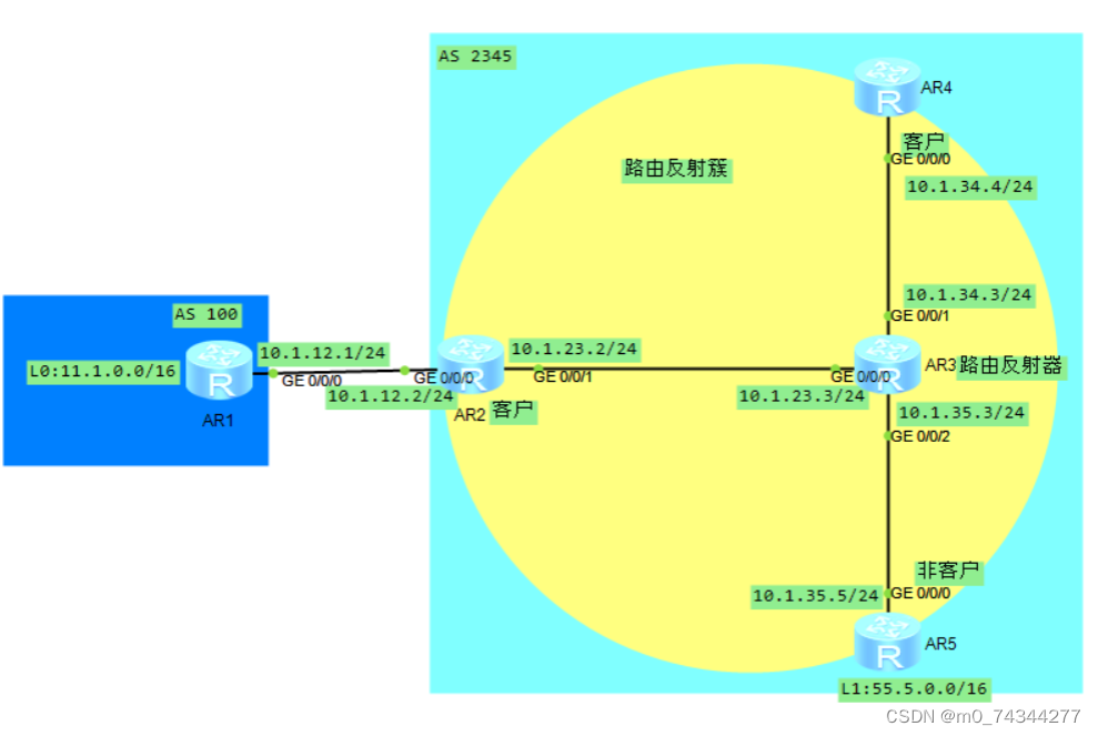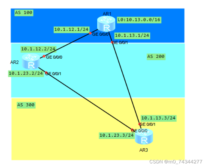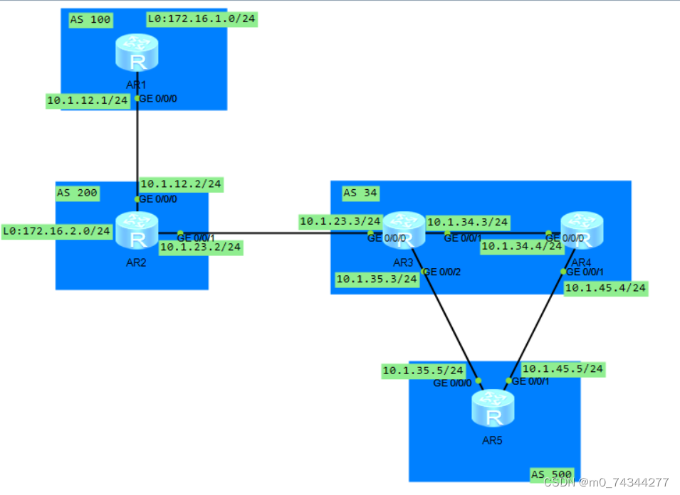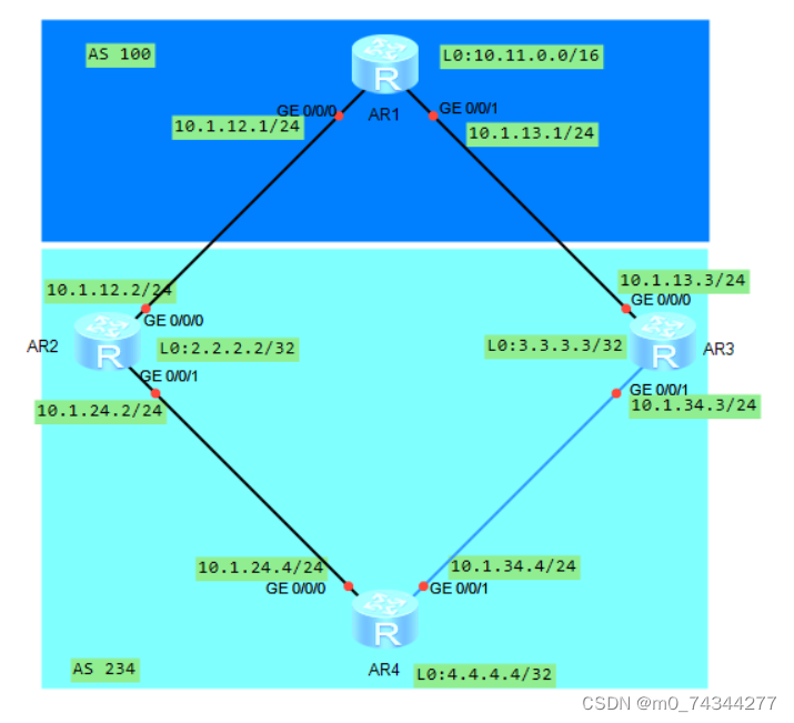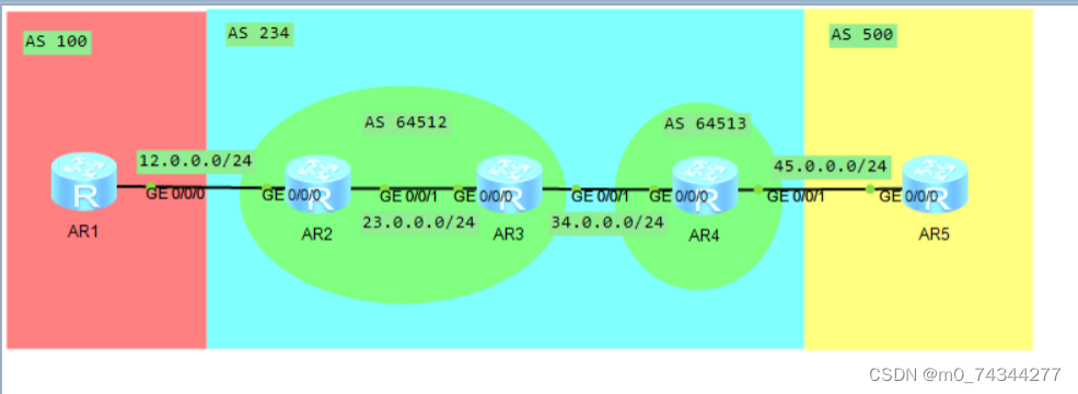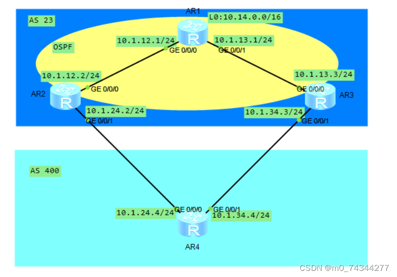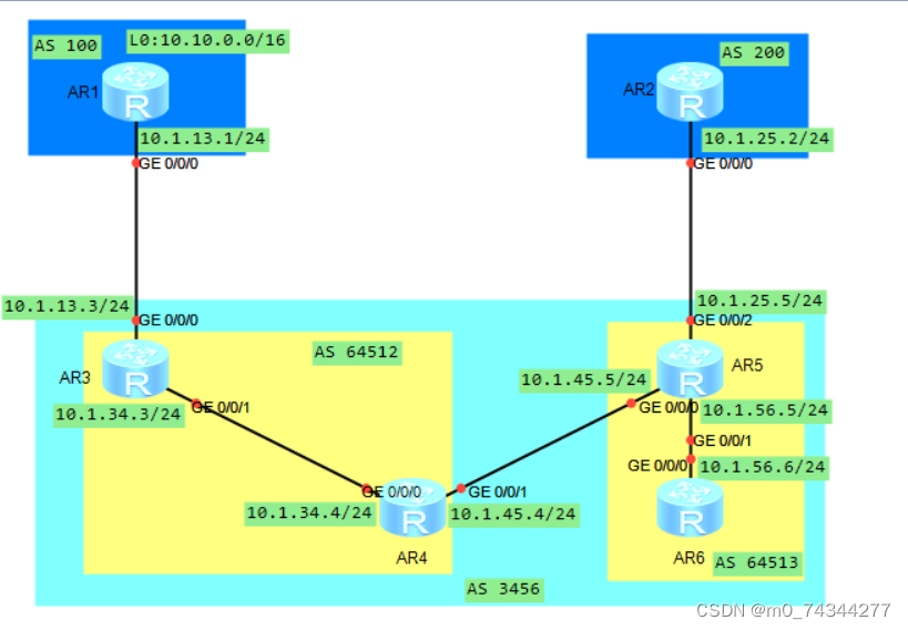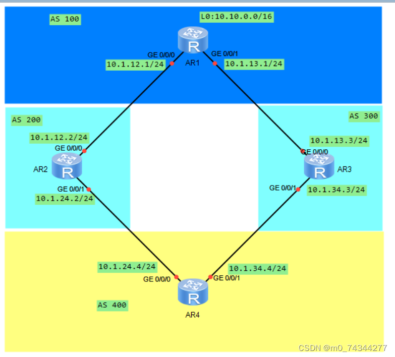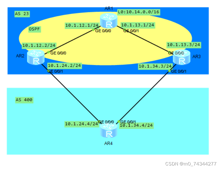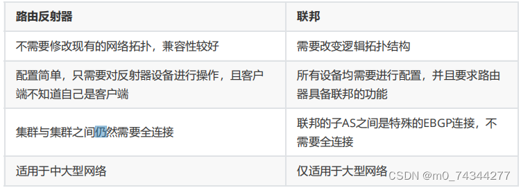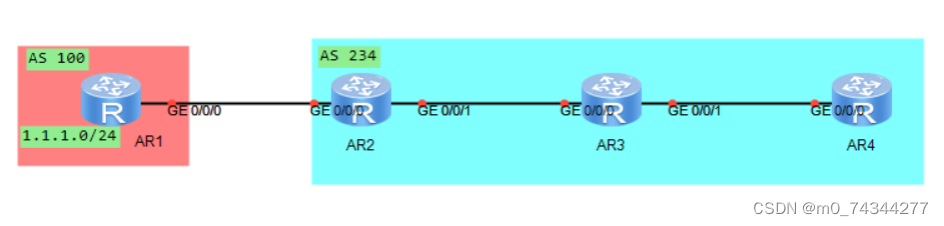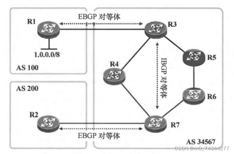 表全局负载均衡。 R4 实现了负载均衡后,无论是否配置了 peer next-hop-local 命令,本地设备都会向自己的 IBGP 对等 体发布路由时,将下一跳修改为本地 。 实现负载均衡需要满足的条件 1. 原始下一跳不同 2. PV 值相同 3. LP 值相同 4. 均为聚合路由或均不是聚合路由 5. 起源码类型相同 6. MED 值相同 7. 均为 EBGP 路由或者 IBGP 路由 8. AS 内部 IGP 的开销值相同 9. AS_Path 属性完全相同,即内容和长度均相同。 [r4-bgp]load-balancing as-path-ignore ----配置路由在形成负载分担时,不需要比较AS_Path属