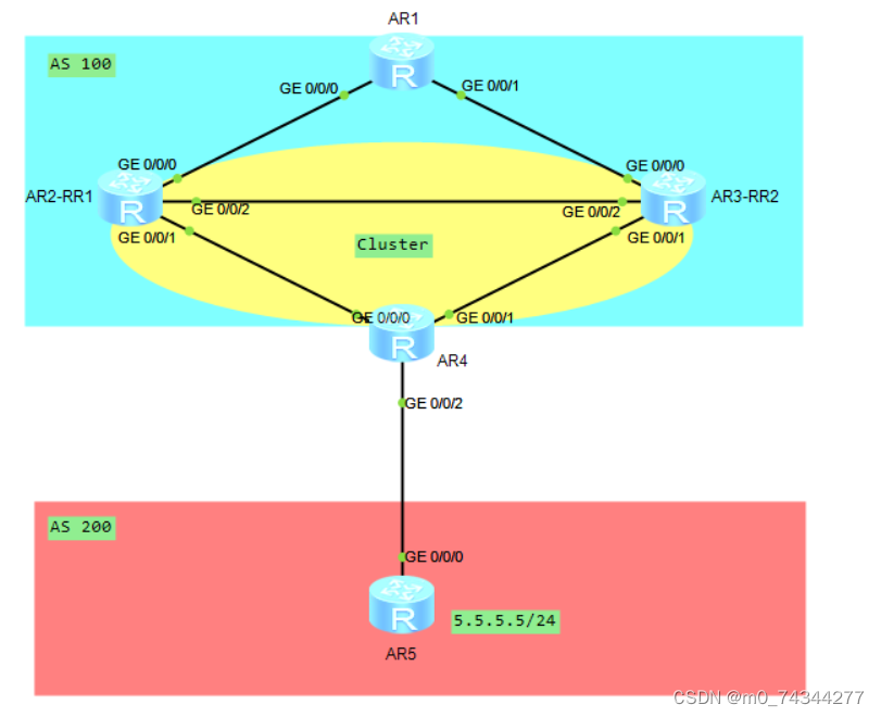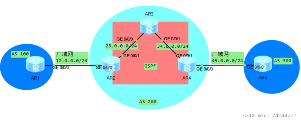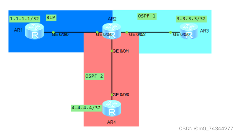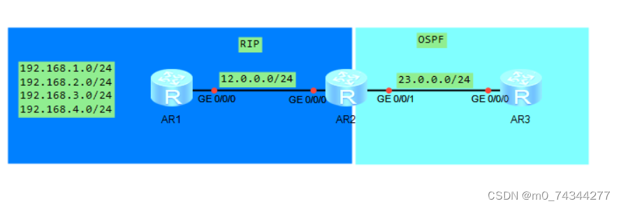 - 将A协议引入到B协议中,在边界设备中的B协议上配置。---表明重发布技术的配置位置。