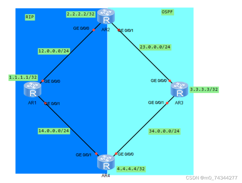 默认RIP和OSPF协议进行双点重发布,由于两者的优先级不同,故第一台ASBR设备重发布动作结束后,将影响其他ASBR设备的路由表。使得路由可能被回传到源协议当中,发生路由回馈-----A协议的路由重发布到B协议当中后,又被重发布回A协议。路由回馈可能会导致选路不佳,甚至是路由环路的出现。