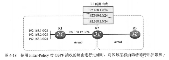 若在R2的入方向使用过滤策略限制192.168.2.0/24路由,则R2将不会具备该路由信息,因为是在R2根据本地LSDB中的LSA信息计算出192.168.2.0/24路由后,拒绝将这条路由信息加入本地路由表中。而R3此时还具备该路由信息,原因在于R3可以正常收到所有的LSA信息,并成功计算路由信息。