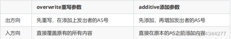 [r3-bgp]peer 10.1.13.1 route-policy AS import additive 参数 ·在原有 AS_Path 属性的基础上添加配置的 AS 号,在最前方添加。 overwrite 参数 ·直接覆盖原有的 AS-Path 属性 ·优势在于灵活可变 ·隐藏路由的真实路径信息 ·用于形成负载均衡 ·缩短 AS-Path 长度 [r3-route-policy]apply as-path none overwrite 将AS_Path属性列表更改为空表
