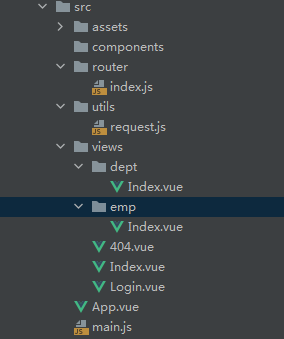 import Router from 'vue-router'Vue.use(Router)export default new Router({routes: [{path:'/login',name:'Login',//component:Logincomponent:()=>import('../views/Login') //按需加载},{path:'/',redirect:'/index'},{path:'/index',name:'Index',component:()=>import('../views/Index'),//子路由children:[{path:'emps',name:'Emps',component:()=>import('../views/emp/Index')},{path:'depts',name:'Depts',component:()=>import('../views/dept/Index')}]},{path:'*',name:'Error',component:()=>import('../views/404')}]
