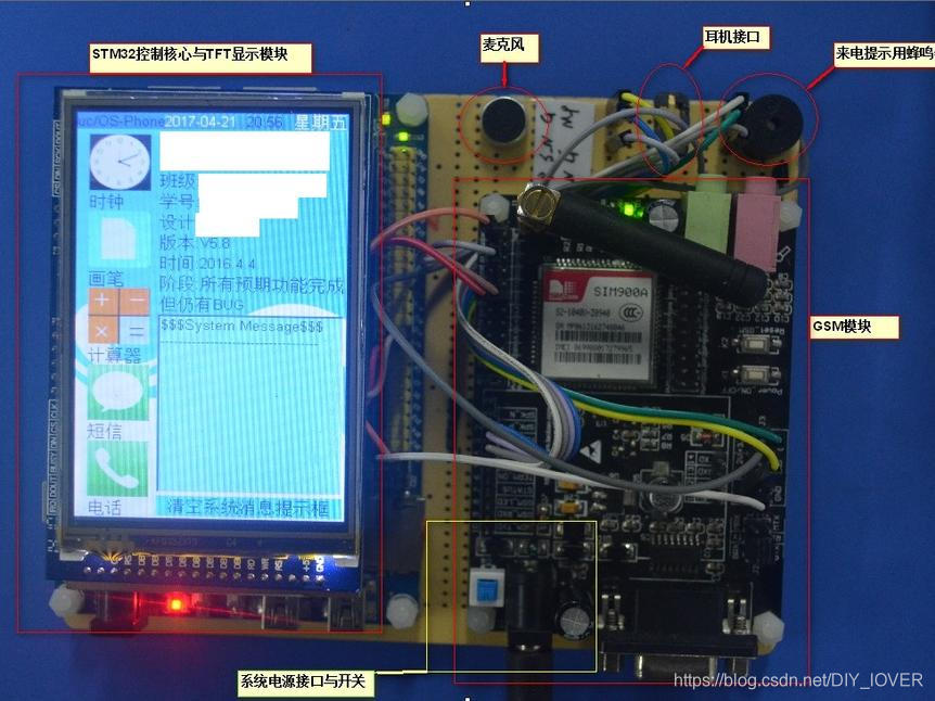 系统通过STM32的SPI接口实现触控从而实现系统的输入、通过STM32的FSMC接口实现TFT显示从而实现系统的输出。通过STM32的串口可有效发送与接收GSM模块的信息。手机SIM900模块GSM通讯系统