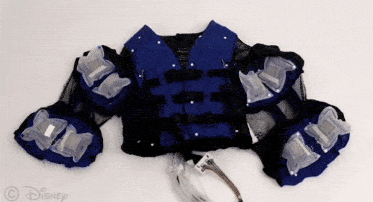 这个名字听起来很有星球大战风格的装备,是麻省理工大学、卡耐基梅隆大学和迪士尼研究中心共同完成的一个体感设计项目,它使用一系列的气囊内置在外套当中,通过控制气囊来给设计以真实的触感。它甚至可以模拟让虫子在皮肤上爬过的感觉。这套装备会让你看起来非常壮实臃肿,距离《头号玩家》里模拟真实触感的贴身外套还有很远的距离,但是它依然可以让你管窥到未来的数字世界。