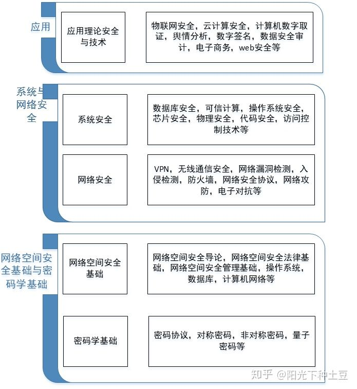 一般而言,会将计算机信息安全研究分为上中下三层:上层做应用,中层为系统安全与网络安全(网络基础,硬件基础,软件基础三方面安全),下层为网络空间安全基础与密码学基础。