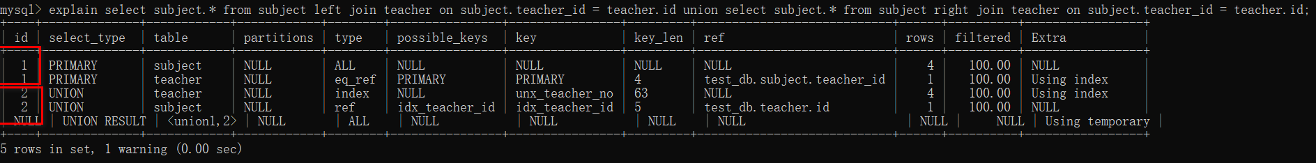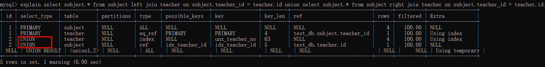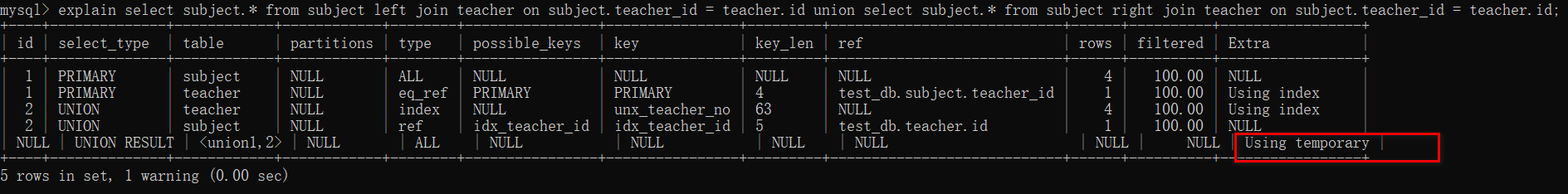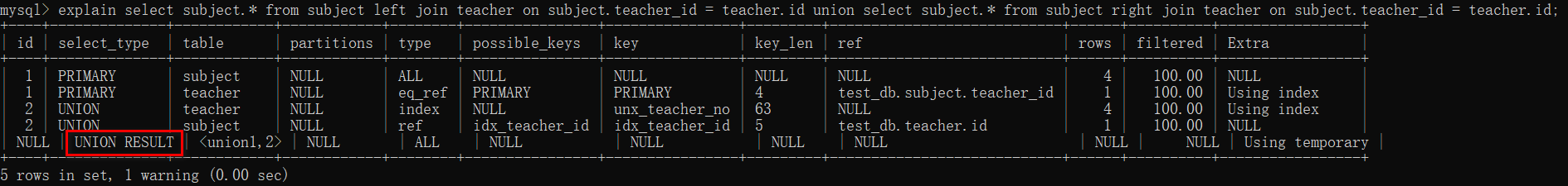 possible_keys: PRIMARY,unx_teacher_nokey: PRIMARY,unx_teacher_nokey_len: 4,63ref: NULLrows: 2filtered: 100.00Extra: Using union(PRIMARY,unx_teacher_no); Using where