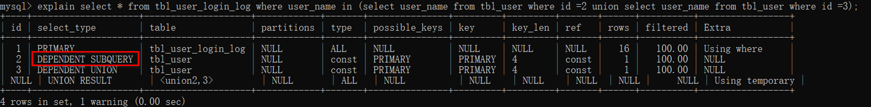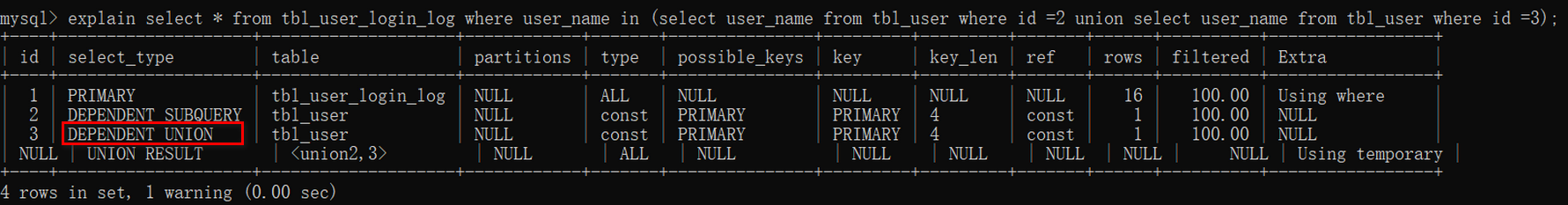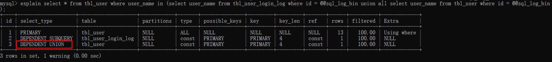 # 例子:explain select * from tbl_user where user_name in (select user_name from tbl_user_login_log where id = @@sql_log_bin union all select user_name from tbl_user where id = @@sql_log_bin);