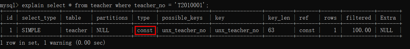 # 例子:explain select * from teacher where teacher_no = 'T2010001';