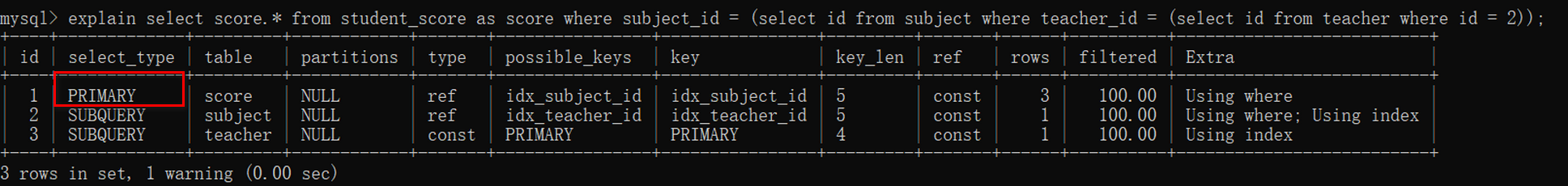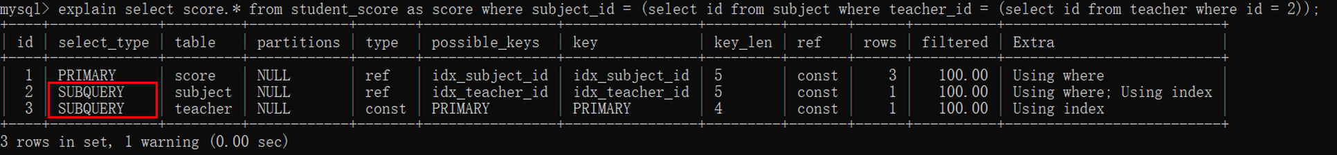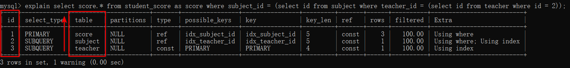 # 例子:explain select score.* from student_score as score where subject_id = (select id from subject where teacher_id = (select id from teacher where id = 2));# 读取顺序:teacher > subject > student_score