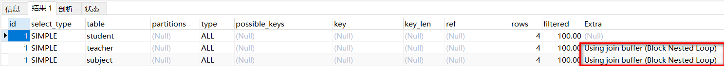 # 我用8.0不是这个提示,我用回5.7进行操作explain select student.*,teacher.*,subject.* from student,teacher,subject;