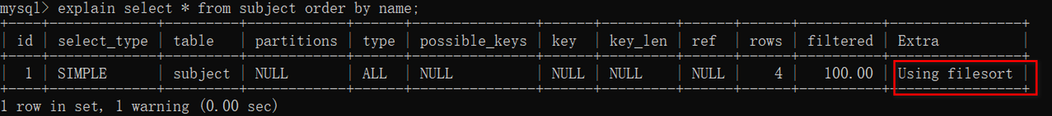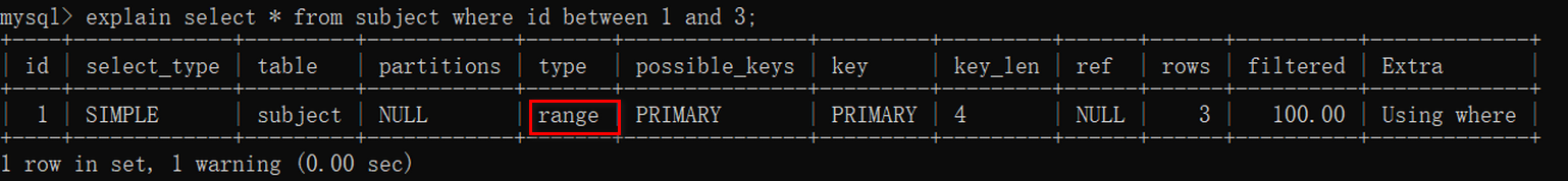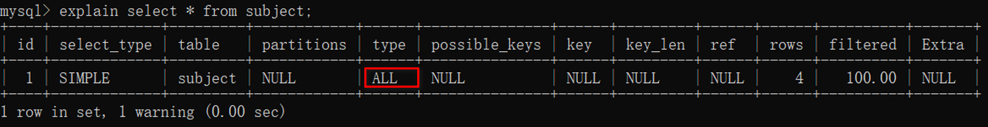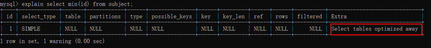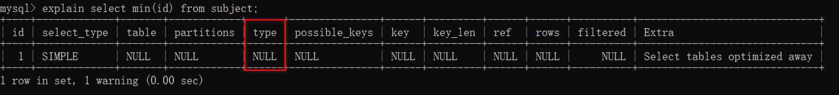 *************************** 1. row ***************************id: 1select_type: SIMPLEtable: subjectpartitions: NULLtype: const
