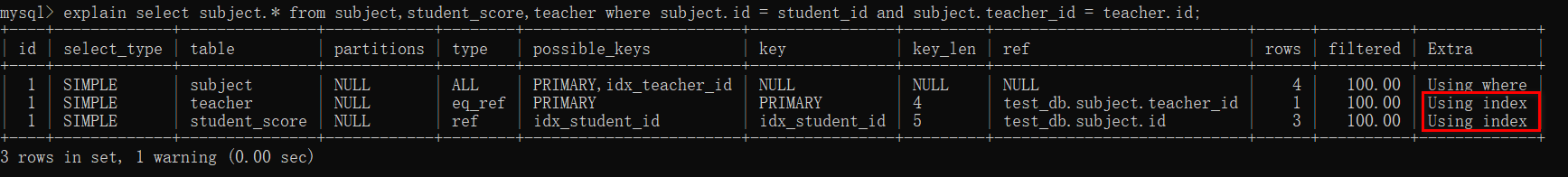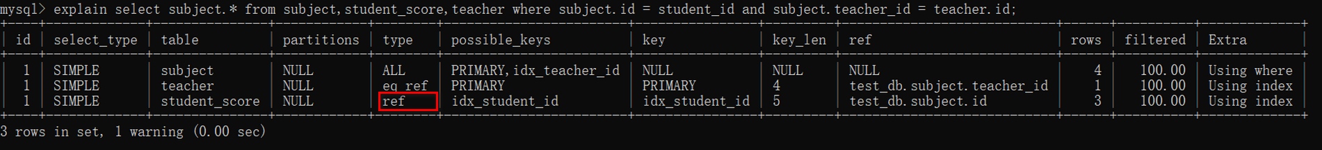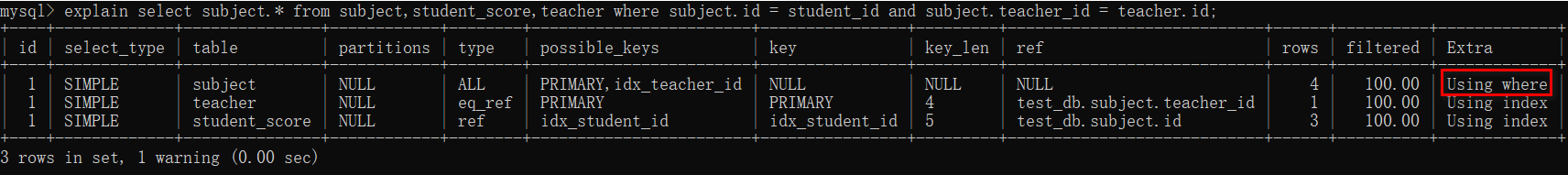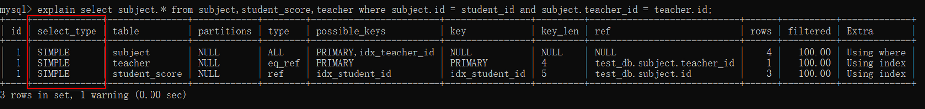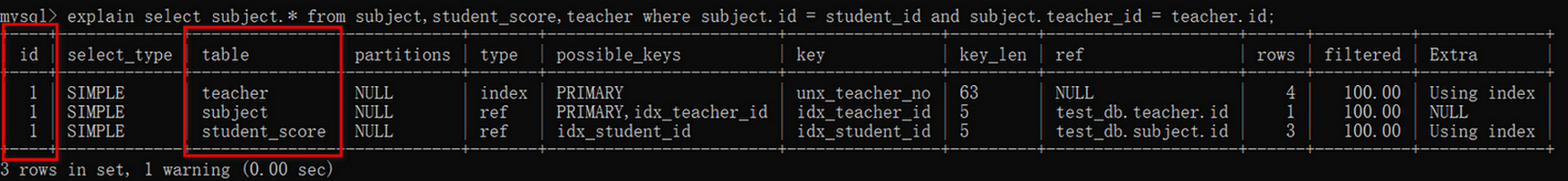 # 例子:explain select subject.* from subject,student_score,teacher where subject.id = student_id and subject.teacher_id = teacher.id;# 备注: