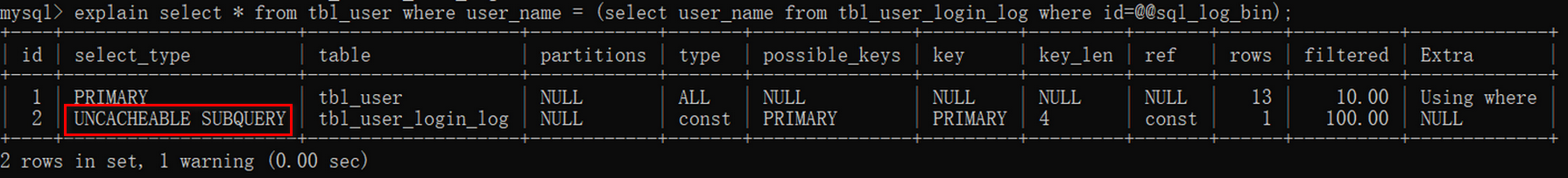 # 例子:explain select * from tbl_user where user_name = (select user_name from tbl_user_login_log where id=@@sql_log_bin);