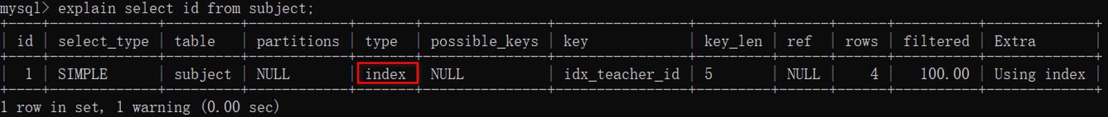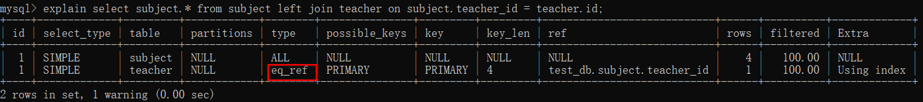 # 例子:explain select subject.* from subject left join teacher on subject.teacher_id = teacher.id;