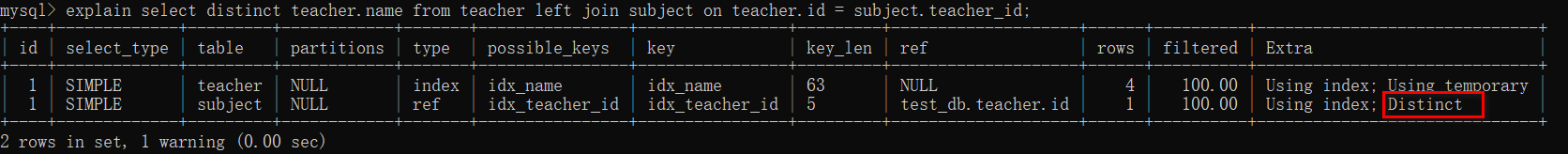 # 例子:explain select distinct teacher.name from teacher left join subject on teacher.id = subject.teacher_id;